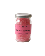 Pétales de rose fraîche, Sucre glace, Sucre, Gomme arabique, Eau, Arôme rose, Colorant E120 (extrait de cochenille).