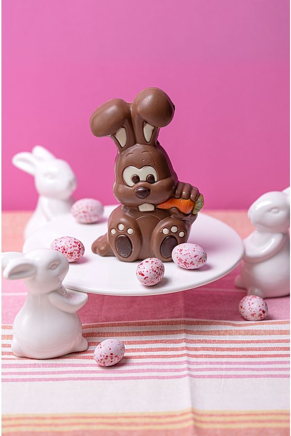 Chaque détail de ce lapin a été pensé pour captiver le regard. De la finesse de ses longues oreilles à l'expression de son petit museau, les maîtres chocolatiers ont mis tout leur cœur pour sculpter une silhouette à la fois élégante et attendrissante. Sa taille de 16 cm en fait le trophée tant convoité d'une chasse aux œufs réussie. Sa robe de chocolat au lait, lisse et brillante, témoigne de la maîtrise parfaite des températures lors du tempérage.